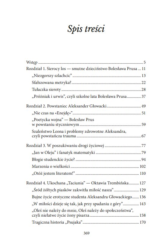 Książka „Prus. Ukryte życie pisarza” to opowieść pełna faktów, hipotez i zaskakujących odkryć, która dowodzi, że życie autora „Faraona” było równie dramatyczne i niejednoznaczne jak losy jego bohaterów. To próba odpowiedzi na pytanie, ile Aleksandra Głowackiego było w Wokulskim, dlaczego Prus milczał o swoim życiu prywatnym i jak bardzo różniło się ono od wizerunku „poczciwego pana z Nałęczowa”. [Opis wydawcy]