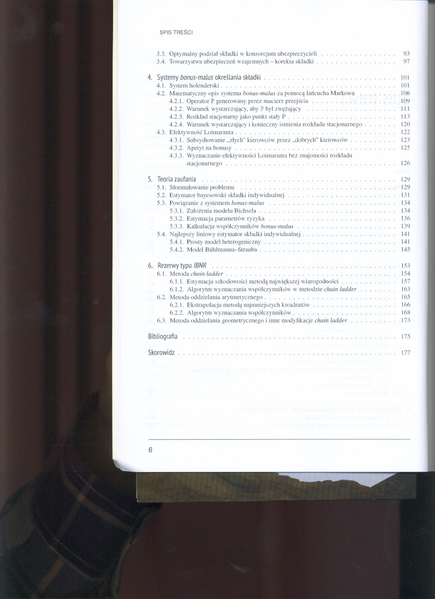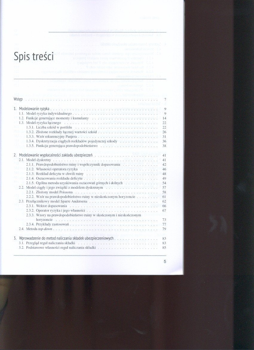 W publikacji omówione zostały podstawowe modele opisujące ryzyko pojedynczych klientów i ich zbiorowości. Przedstawione są modele wypłacalności ubezpieczyciela, ze szczególnym uwzględnieniem modeli dyskretnych. Specjalną uwagę poświęcono przełącznikowemu modelowi Sparre Andersena, na temat którego w literaturze można znaleźć niewiele wyników. Książka zawiera też przegląd podstawowych reguł naliczania składek oraz prezentuje metodę bonus-malus indywidualizacji składki pojedynczego klienta z uwzględnieniem historii jego szkodowości. Autor przedstawia teorię zaufania i jej związek z metodą bonus-malus, omawia podejście bayesowskie, model Bühlmanna-Strauba oraz metody tworzenia rezerw dla ubezpieczeń majątkowych.