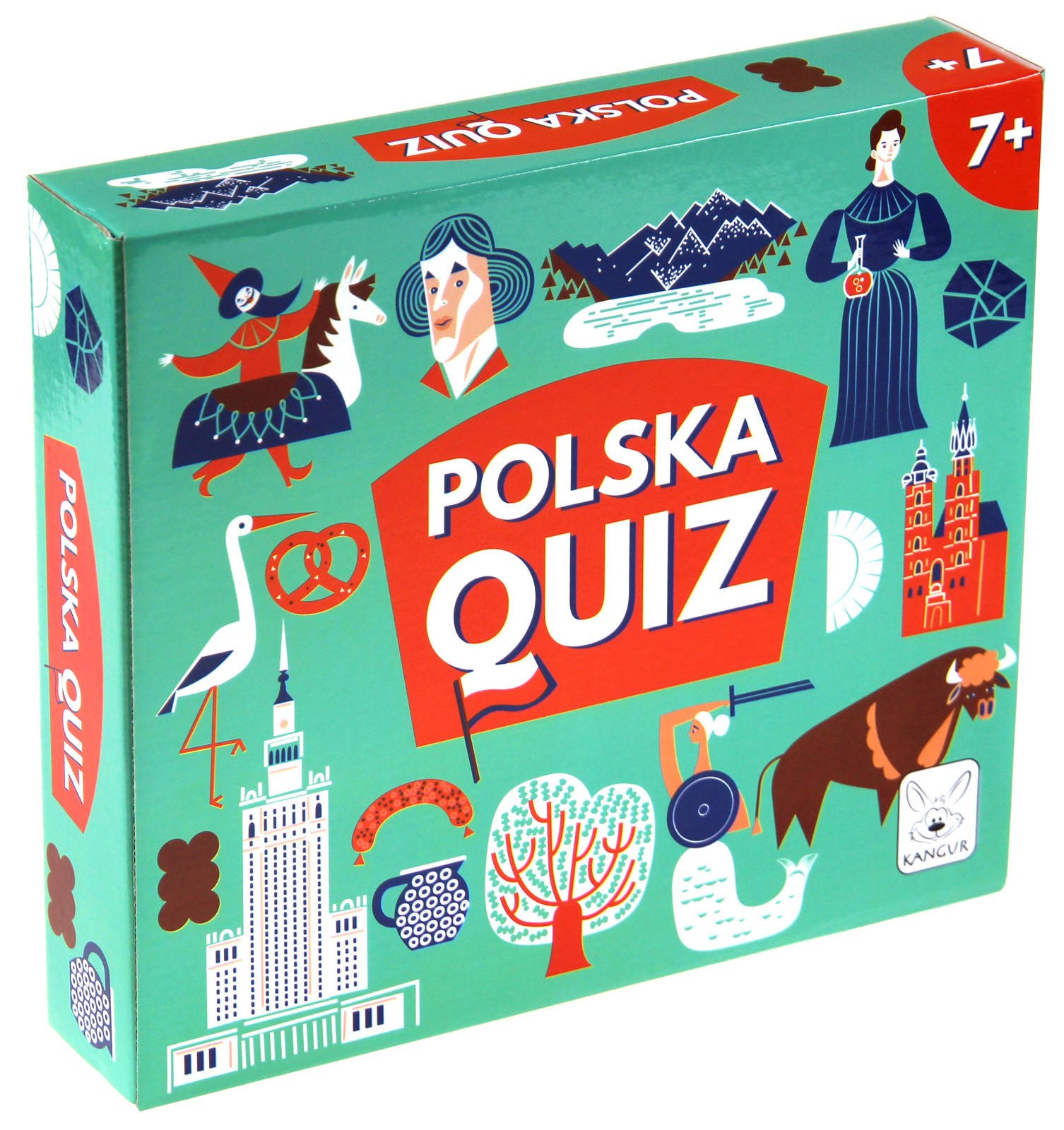 Polska : quiz. - Warszawa : Kangur, [2020]. - 1 gra (55 kart do gry, 150 pytań, 30 kart dat, 4 karty ruchu, 1 plansza, 4 pionki) : karton, plastik, tektura, kolor ; w pudełku 6x26x24 cm + instrukcja.